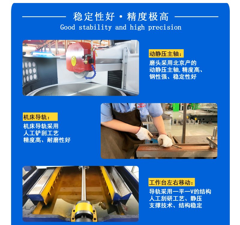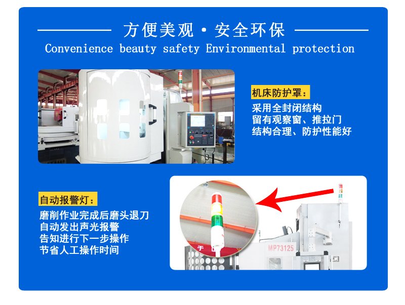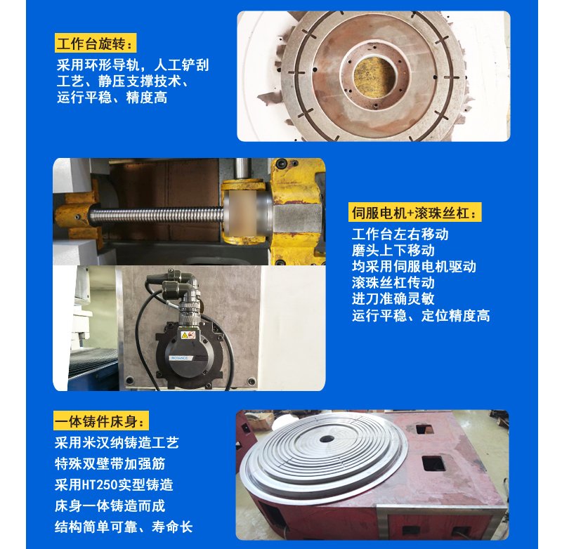 產品說明:MP73100/M73100臥軸(zhou)圓臺平面(mian)磨(mo)床,采(cai)用工作臺在床身圓導軌(gui)上(shang)固(gu)定旋轉,雙立柱橫梁, 拖(tuo)(tuo)板(ban)在橫梁上(shang)做縱向(xiang)往復(fu)移動(dong)(dong), 磨(mo)頭沿(yan)拖(tuo)(tuo)板(ban)垂直移動(dong)(dong)進給布(bu)局型(xing)式,整體結構穩重緊(jin)湊,精(jing)度高(gao)性能可靠、制造(zao)工藝性好(hao)、操作使用方便、采(cai)用砂輪周邊磨(mo)削,工件(jian)上(shang)下兩平面(mian)可獲得(de)要(yao)求較高(gao)的(de)平行度,尺(chi)寸精(jing)度和工件(jian)表面(mian)粗糙度。